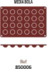 Форма для выпечки полушар 850.006. Материал: силикон. Размеры: один полушар d=3см, h=1,5см; общий размер формы 30х17,5 см. Количество выемок на форме: 24. Выдерживает температуру от -60С до +230С. Рекомендовано для контакта с пищевыми продуктами. Поверхно