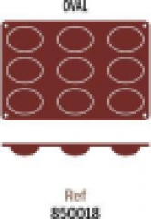 Форма для выпечки овал 850.018. Материал: силикон. Размеры: один овал 7х5см, h=2см; общий размер формы 30х17,5 см. Количество выемок на форме: 9. Выдерживает температуру от -60С до +230С. Рекомендовано для контакта с пищевыми продуктами. Поверхность антип