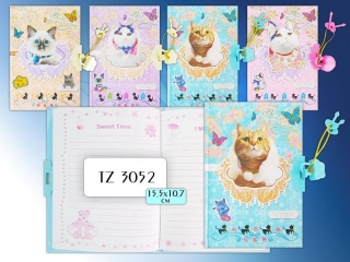 Блокнот с замком TZ-3052 155*107. твердая обложка c блестками Котенок ассорти