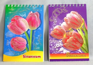 Блокнот на на гребне А6. 48 листов Полиграфсоюз с лаком c блестками Тюльпан ассорти