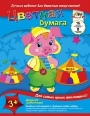 Бумага цветная двухсторонняя 16 листов 8 цветов А4. АППЛИКА Поросенок в цирке